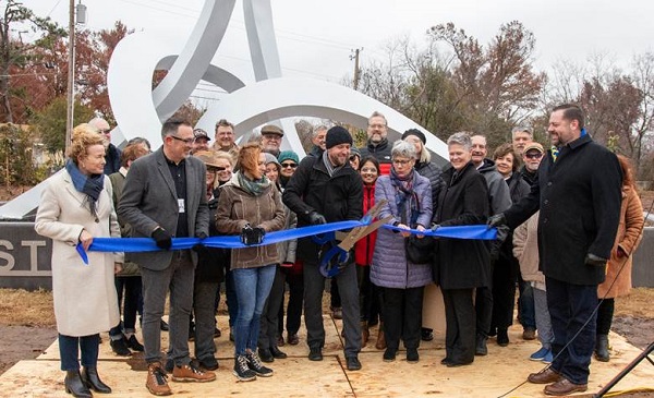 (Stillwater, OK) – “Interlaced,” a major piece of public art, was dedicated Friday, Dec. 1, in Stillwater, thanks to the generosity of community members with a vision of providing a beautiful welcome at one of the city’s busiest intersections. A series of private donations, first the land, then funding to beautify the corner at 6th Avenue and Western Road that is considered a gateway to Stillwater, made the sculpture project possible. “Interlaced” is a massive piece, consisting of interwoven ribbons of steel measuring 16 feet high, 30 feet wide and 15 feet deep.
