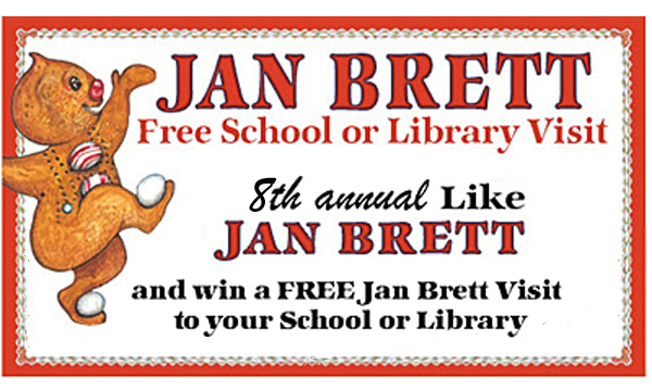The school or library that has the most parents, teachers, friends, or supporters who enter the contest will win a free school or library visit from Jan in the 2018-2019 school year. Contest ends April 2, 2018. 2nd to 10th prizes of 10 Jan Brett books. 11th to 100th prize of a signed Jan Brett Poster.