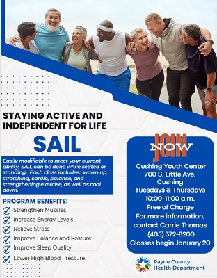 STILLWATER, Okla. – The Payne County Health Department is offering a SAIL (Staying Active and Independent for Life) class at the at the Cushing Youth Center, 700 S. Little Ave., in Cushing. Classes are from 10:00 to 11:00 a.m. each Tuesday and Thursday beginning January 20, 2026.