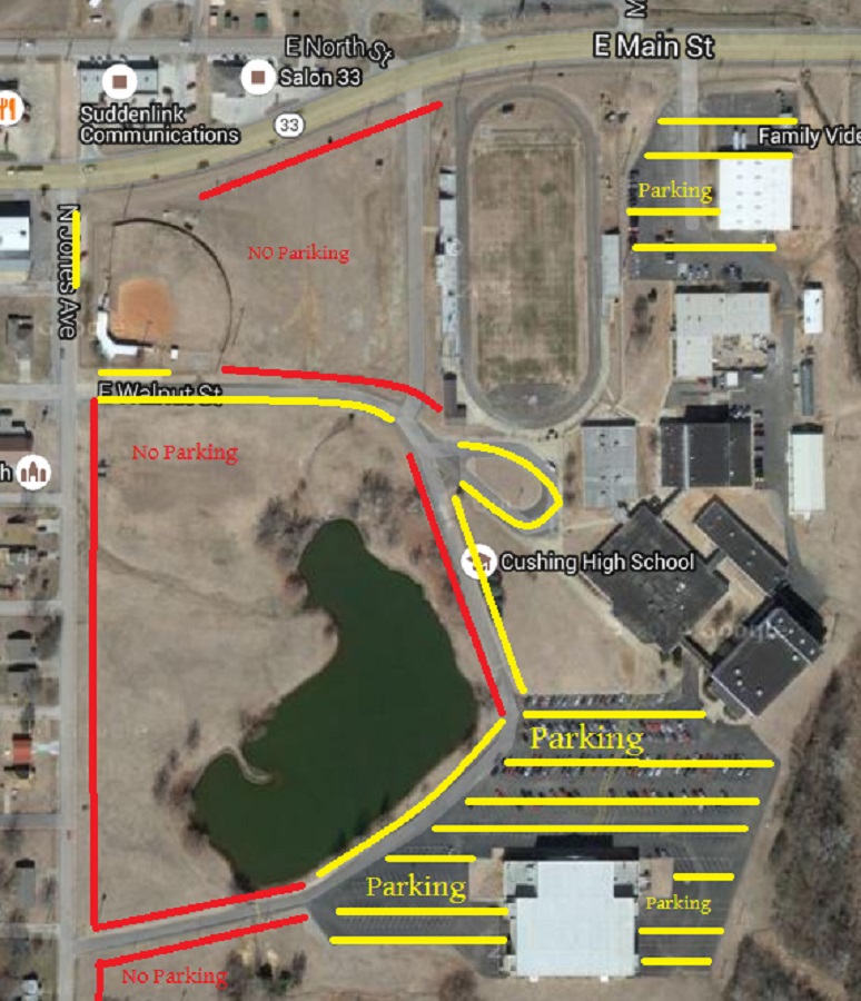 We have attached an overview picture of the Cushing High School, which depicts parking areas in yellow and non-parking areas in red. We apologize for any inconvenience this may cause and appreciate your cooperation.
